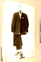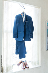 Men's new marine navy blue suit and tie groom closeup wedding preparation, pants, brown leather shoes, belt hanging on window hanger in bright room