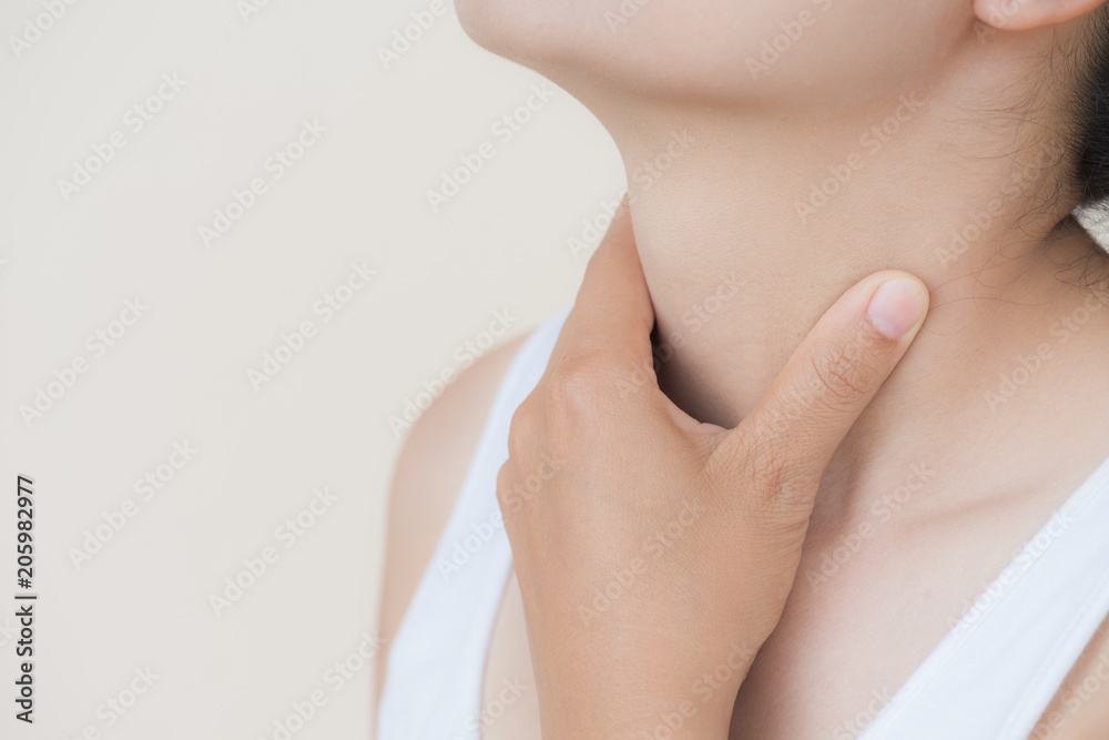 Sore Throat. Closeup Of Beautiful Young Woman Hand Touching Her Ill Neck. Healthcare and medical concept.