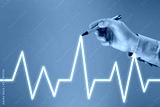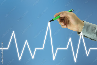 businessman hand with a pen pointing to the top line of a graph on blue background.