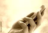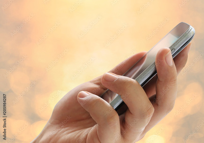 Hand of man holds a smartphone on blur gold bokeh background and have copy space.