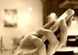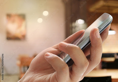 Hand of man holds a smartphone on blur restaurant background and have copy space.