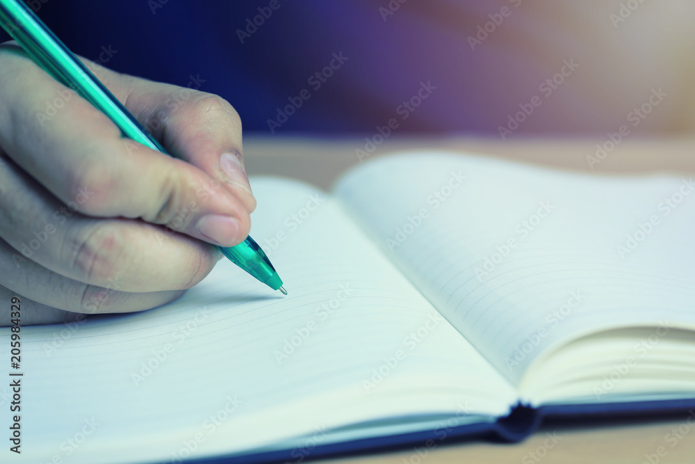Green pen in a man hand on a empty notebook of education and business ideas.