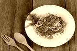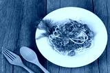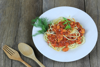 Spaghetti with tomato sauce in a white dish on wooden floor background and have copy space.