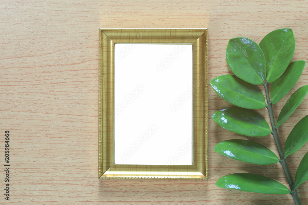 Vintage photo frame on a wooden floor and green leaf of branch put aside and have copy space.