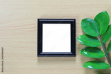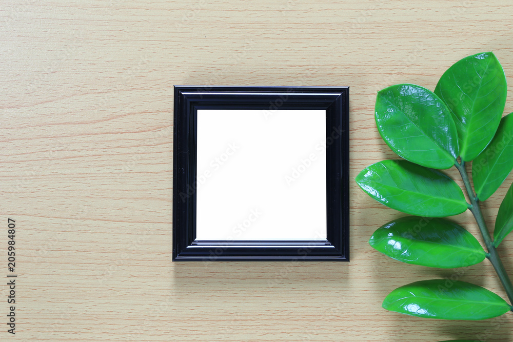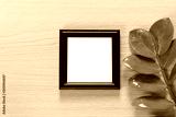 Vintage photo frame on a wooden floor and green leaf of branch put aside and have copy space.