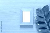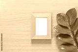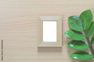 Vintage photo frame on a wooden floor and green leaf of branch put aside and have copy space.