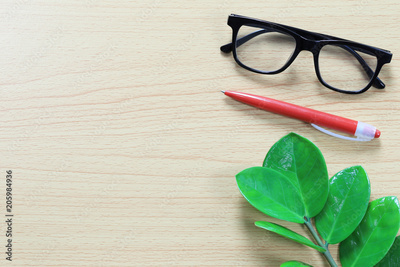 Spectacles and red pens are placed on a brown wooden floor and have copy space.