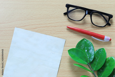 Blank paper note and eyeglasses placed on a brown wooden floor.