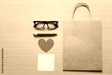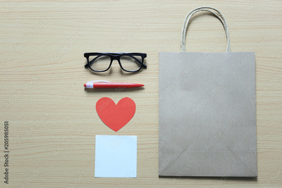 Brown Paper bags and accessories on the wooden floor and have copy space.