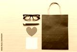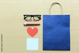 Blue Paper bags and accessories on the wooden floor and have copy space.