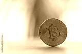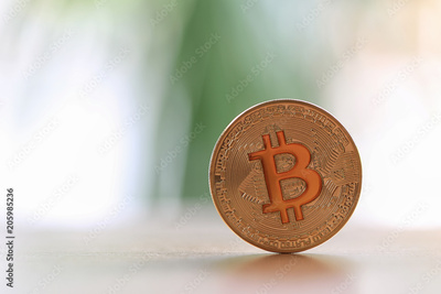 Golden Medal of bitcoin on wooden floor and have copy space.