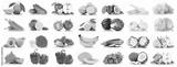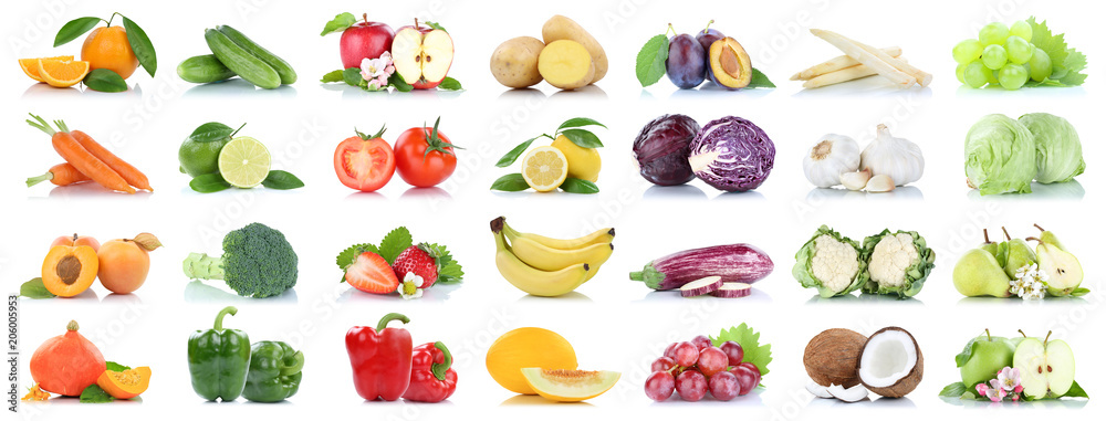 Obst und Gemüse Früchte viele Apfel Tomaten Orangen Salat Zitrone Farben Freisteller freigestellt isoliert
