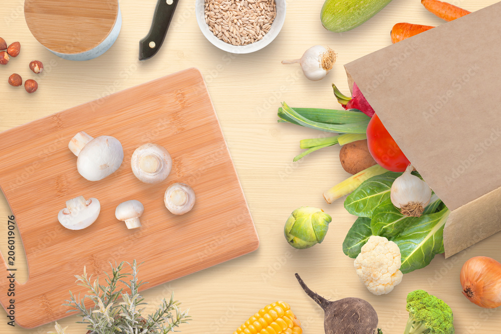Kitchen table with cutting board, mushrooms, spices and fresh vegetables from city market.