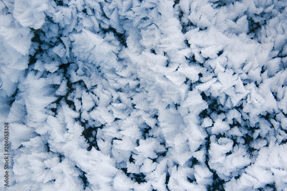 Frozen sharp blue azure ice crystals close up, abstract winter background