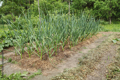 Garlic grows on a bed under mulch from dry grass. Growing spices in the organic oak for vegetarian food.