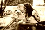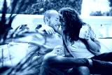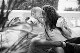 Happy couple or friends flirting talking and drinking in a restaurant terrace and hugging loving each other. Love and youth concept