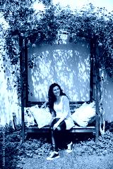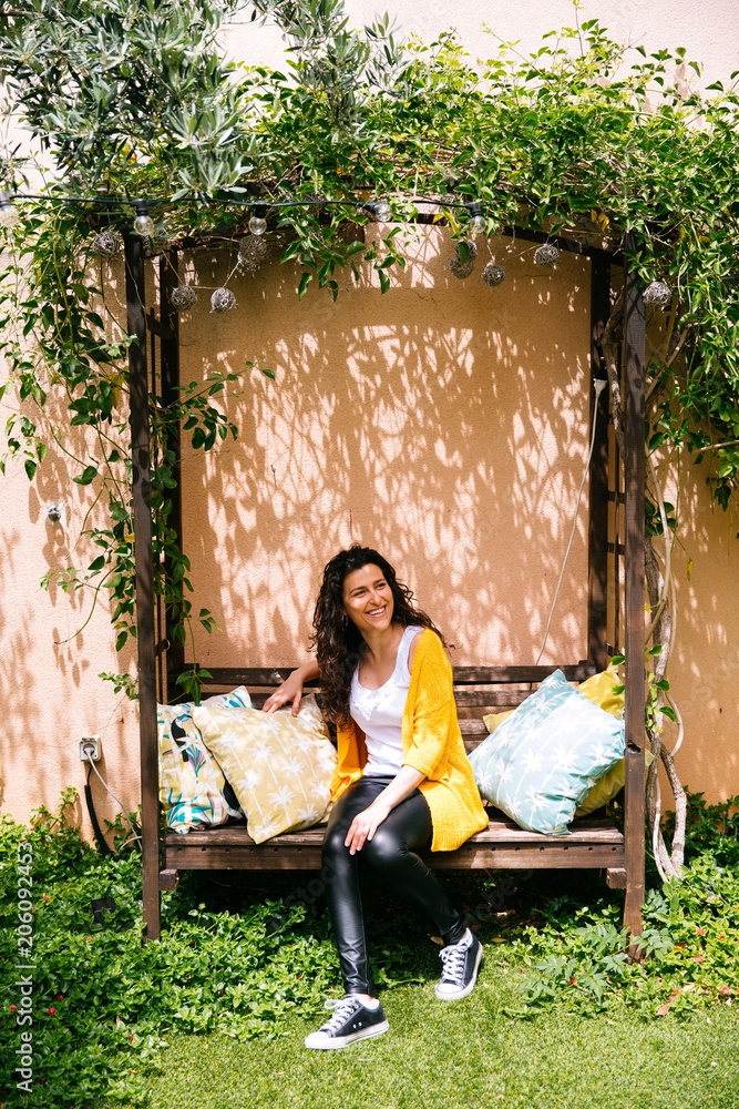 happy young woman sitting on a bench in a garden