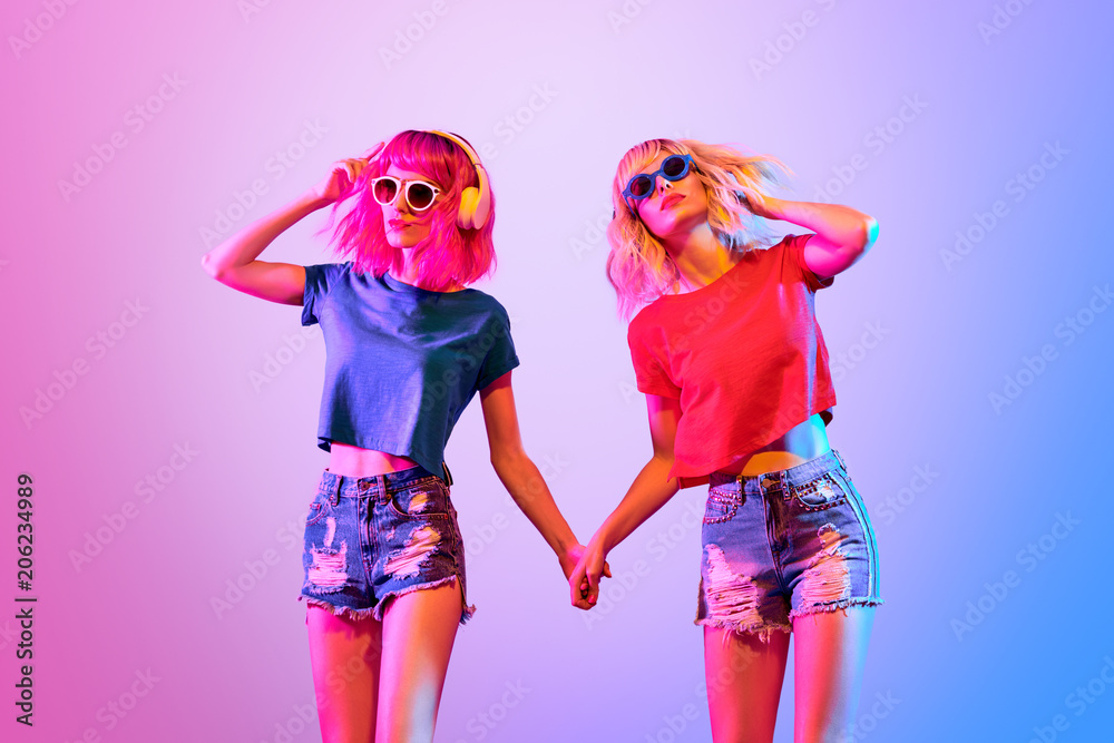 Two DJ Girl Hipster with Fashion Hairstyle Dance.