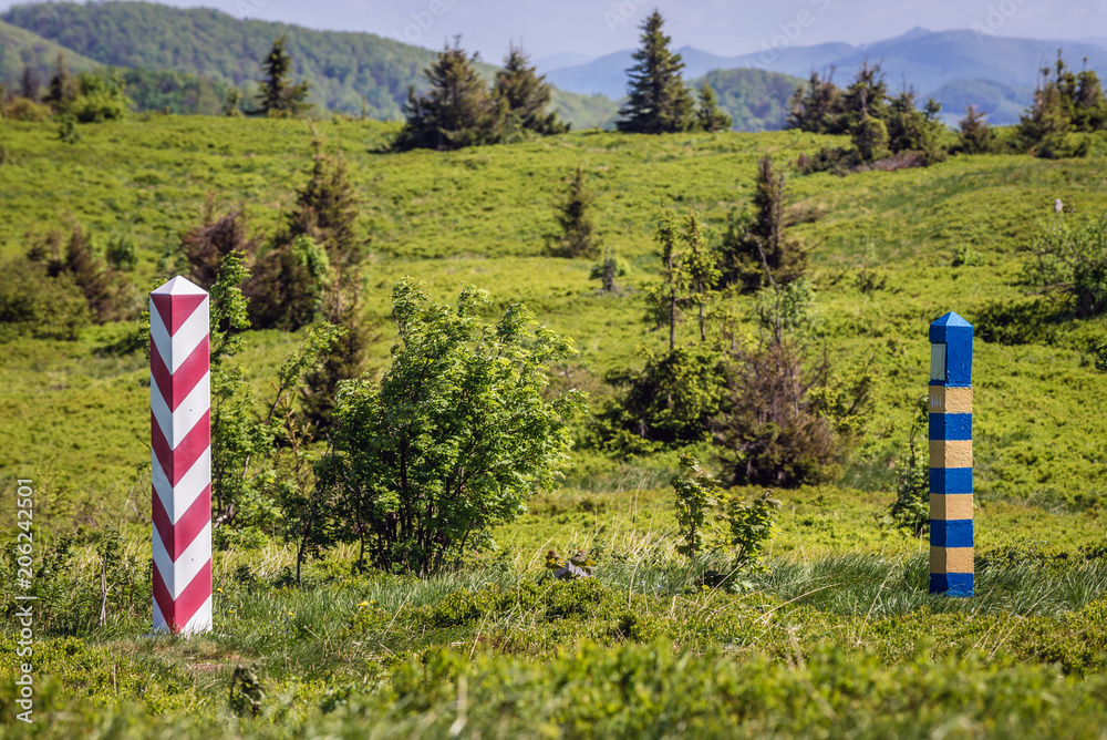 Border zone between Poland and Ukraine seen from a trail near Bukowa mountain pass in Bieszczady Mountains National Park in Poland
