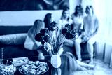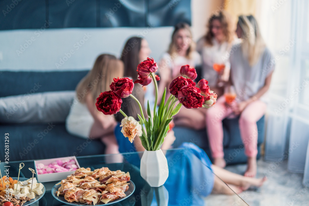 Girls Party. Beautiful Women Friends Having Fun At Bachelorette Party. They are Celebrating And Drinking Champagne At Hen Party. Selective Focus on food.