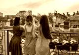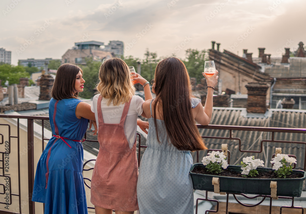 Girls Party. women are standing on the balcony and watching, drinking Champagne