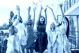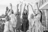 Girls Party. Beautiful Women Friends on the balcony Having Fun At Bachelorette Party. They are dancing in confetti with hands up
