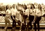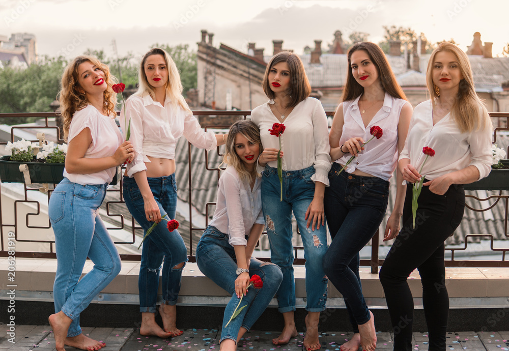 Girls Party. Beautiful Women Friends on the balcony or roof with flowers At Bachelorette Party. They wear same clothes