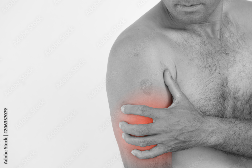 Closeup man elbow and arm pain and injury on white background. Health care and medical concept.