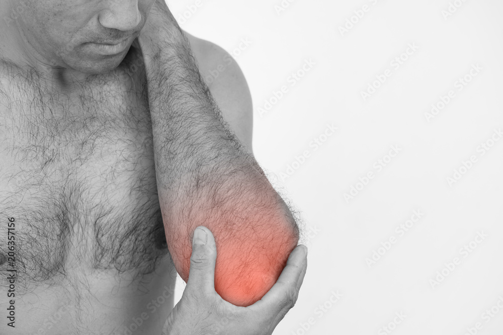 Closeup man elbow and arm pain and injury on white background. Health care and medical concept.