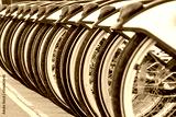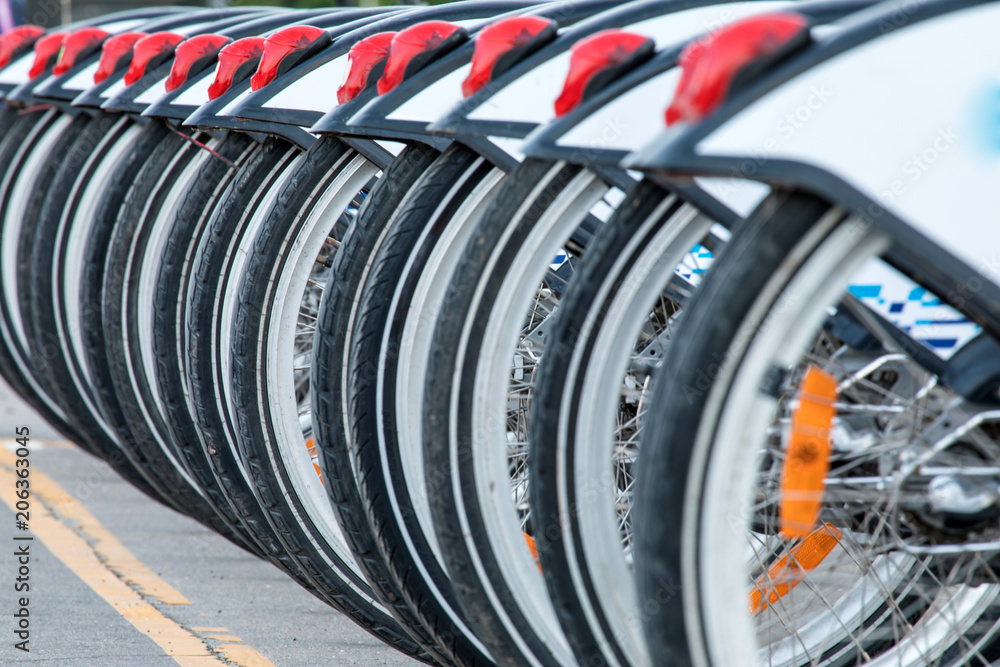 Many bicycles standing one by one in the asphalt path. The symbol of sport and healthy lifestyle