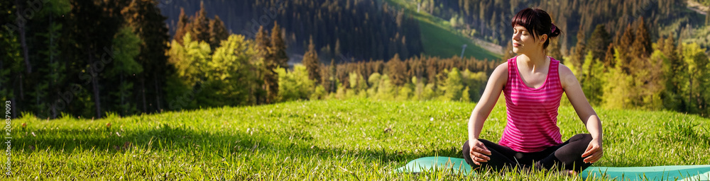 The young girl sitting on a mountaintop. Banner for website. The concept of a healthy lifestyle, travel and yoga.