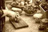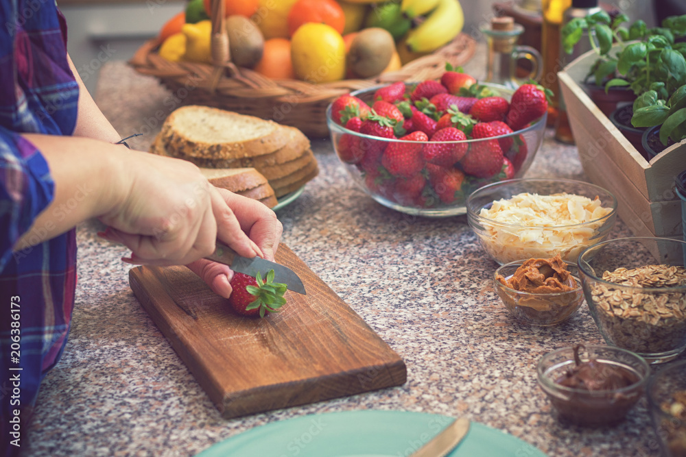 Young women cutting fresh strawberries while preparing healthy sweet toasts for the breakfast
