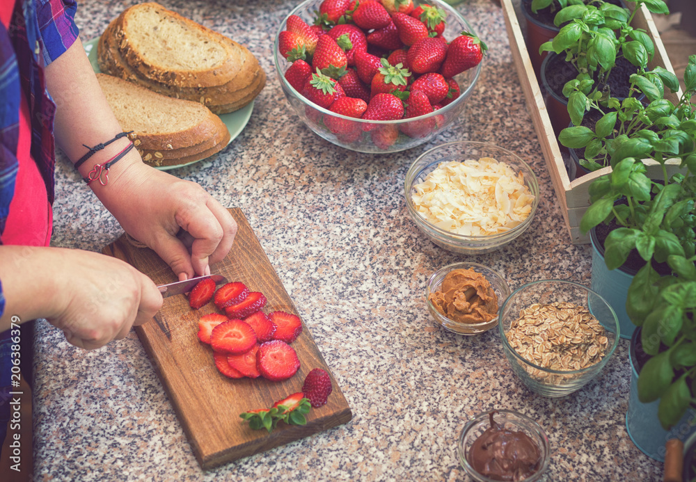 Young women cutting fresh strawberries while preparing healthy sweet toasts for the breakfast