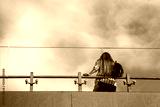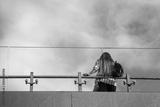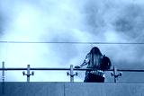The view on the observation deck with the obstacle of steel and glass and the girl upwards