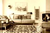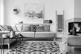 Patterned carpet in decorative living room interior with painting above couch. Real photo