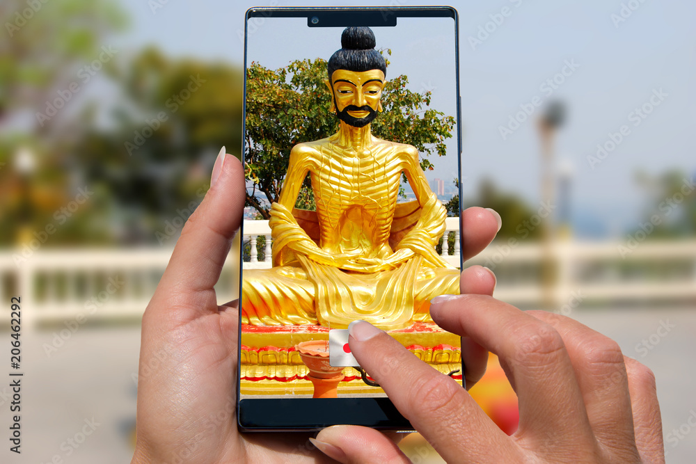 Woman with mobile phone photos temple the tours of Thailand.