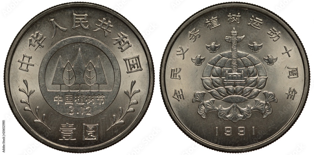 Chinese coin 1 one yuan 1991, planting trees festival, stylized trees in circle, hieroglyphs, Huabiao column in front of stylized globe, flanked by four birds, flowers below,