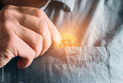 Hand putting into pocket bitcoin - symbol of crypto currency.