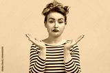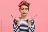 Portrait of puzzled hesitant young female model dressed in retro clothing, shrugs shoulders as doesn`t know what to wear on party, has doubtful expression, isolated on pink background. So what?