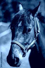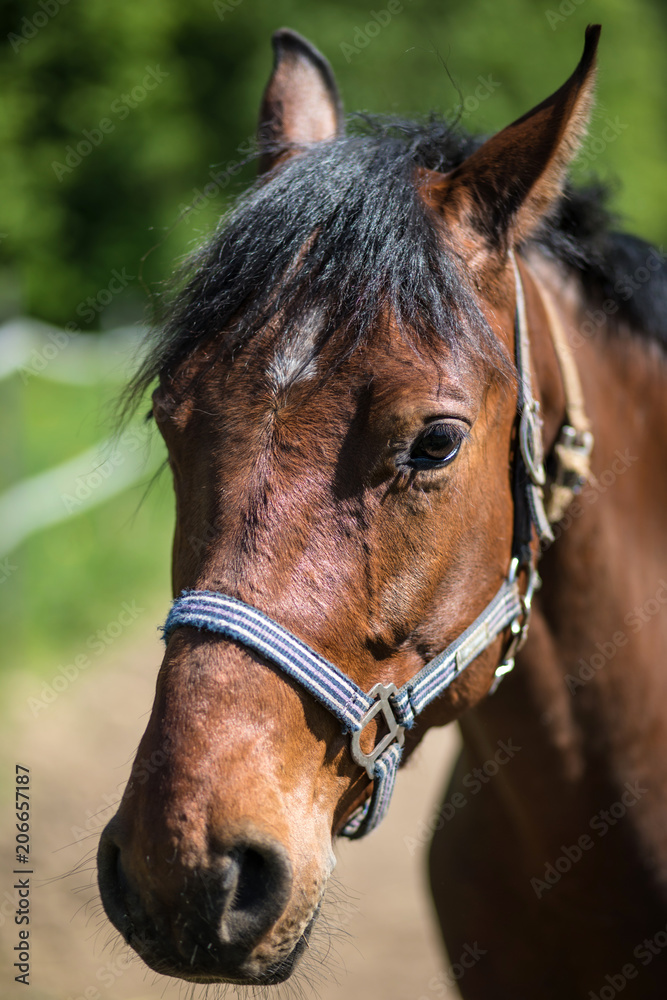 The head of brown Hanoverian horse in the bridle or snaffle a with the green background of trees an grass in the sunny summer day