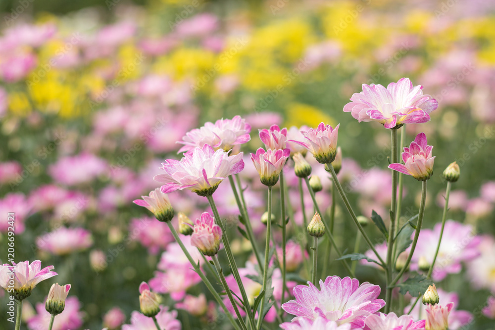 Beautiful Pink and Purple and Yellow chrysanthemum flower blooming in garden. Soft focus.