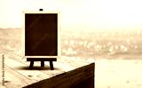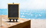 Blank blackboard on wood table food stand with blur sand beach and blue sea with bokeh light background.Template Mock up for summer vacation promotion sale.