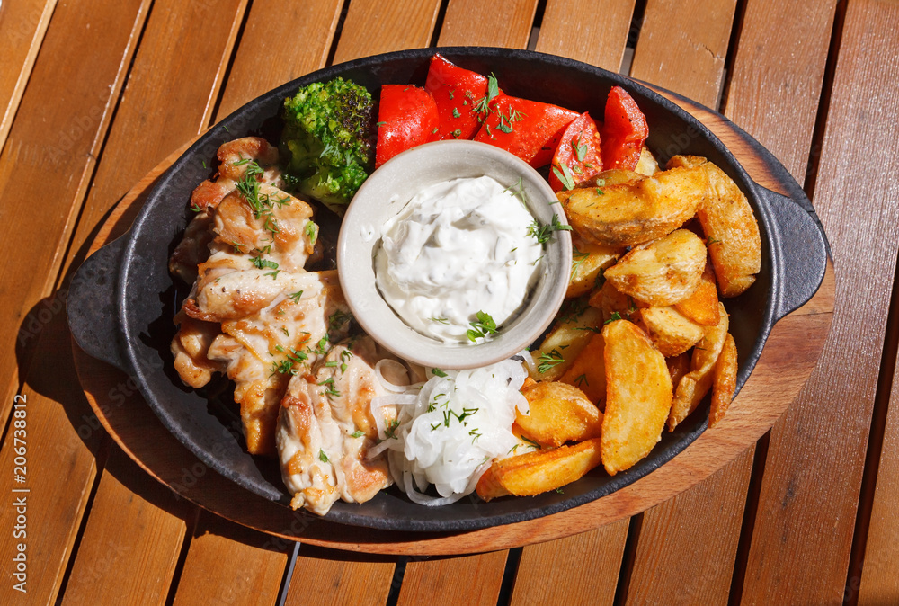 Fried chicken and French fries with white sauce on a black cast-iron frying pan