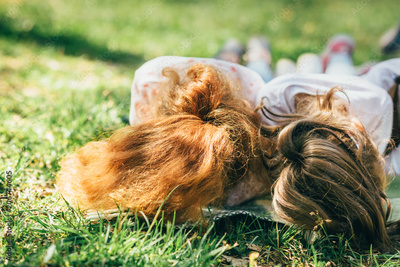 Girls are lying on the grass with hair laughing