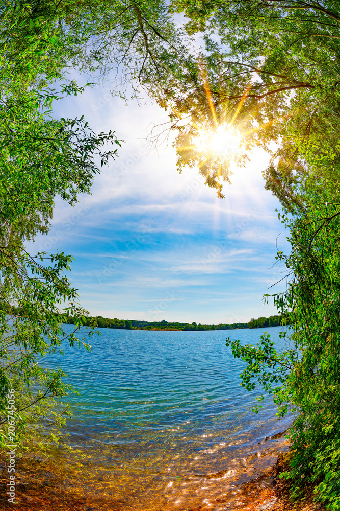 Lake with trees and bright sun on a hot summer day