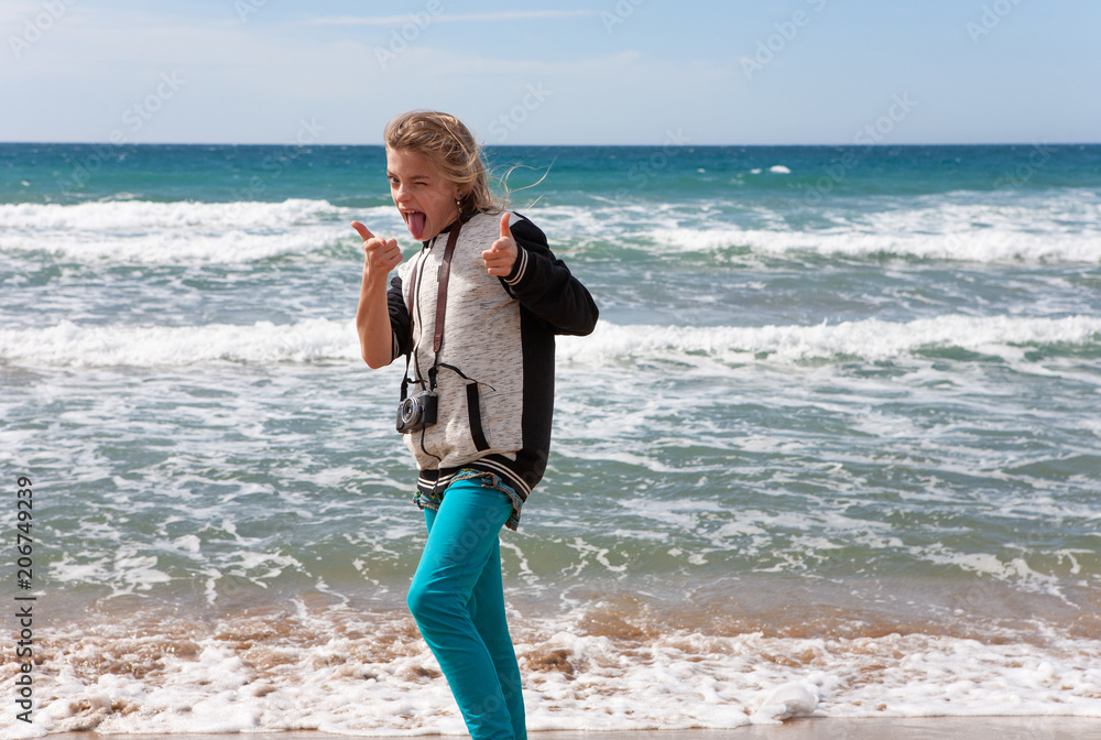 Children and travel - Happy young girl standing at the beach with a camera around her neck.