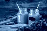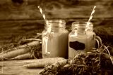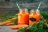 Fresh Carrot and carrot juice on Wooden Table in Garden. Vegetables Vitamins Keratin. Natural Organic Carrot lies on Wooden background.