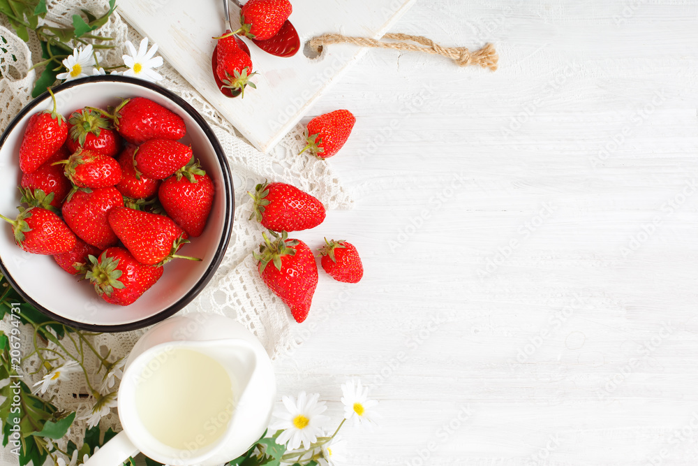 Ripe and tasty strawberry on a white wooden table.