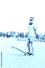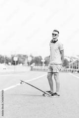 Skateboarder dressed in grey t-shirt and sunglasses stay with longboard on the city road