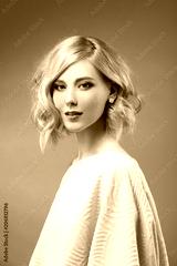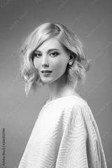 Woman with blonde hair in a white dress with nude makeup on a gray background